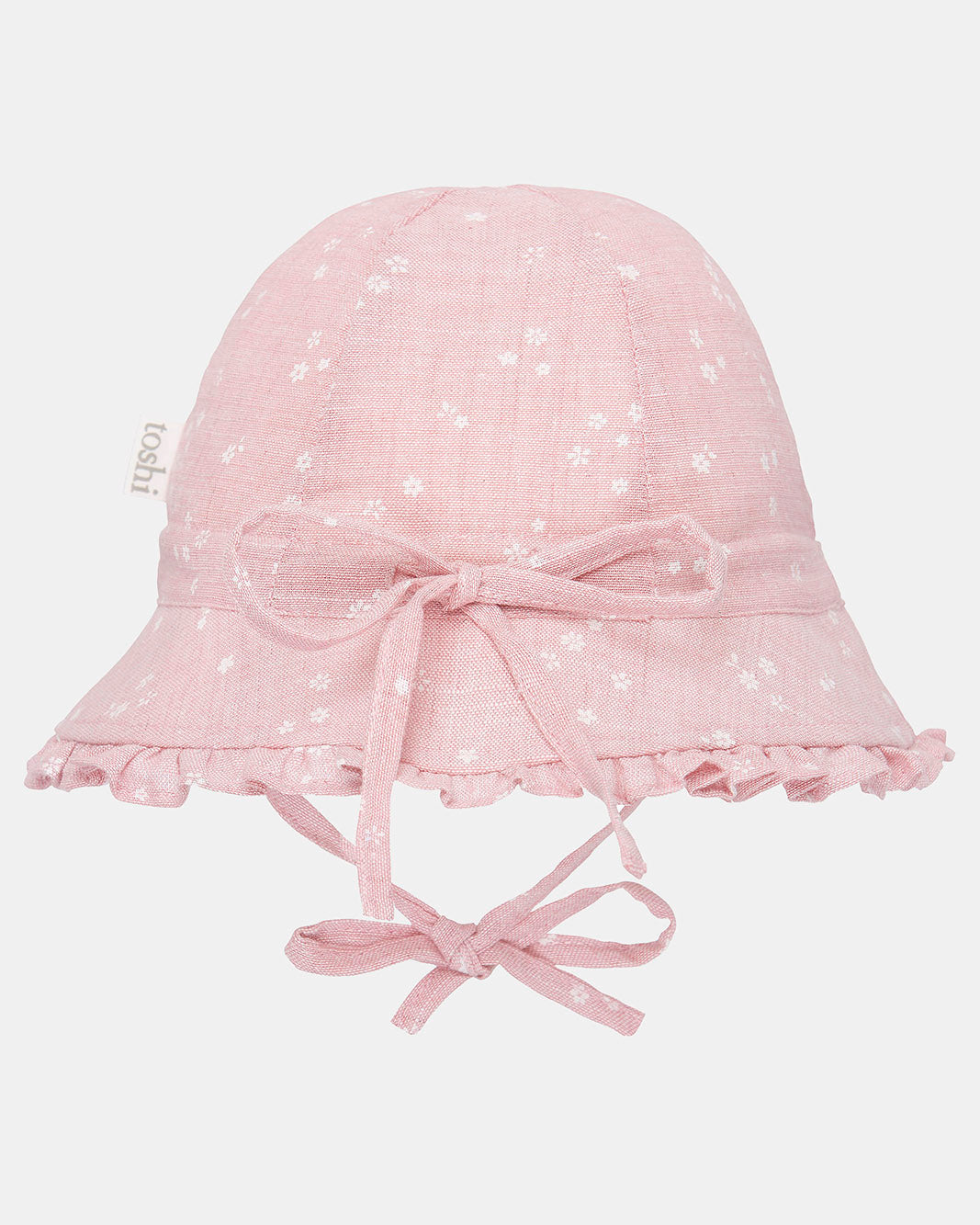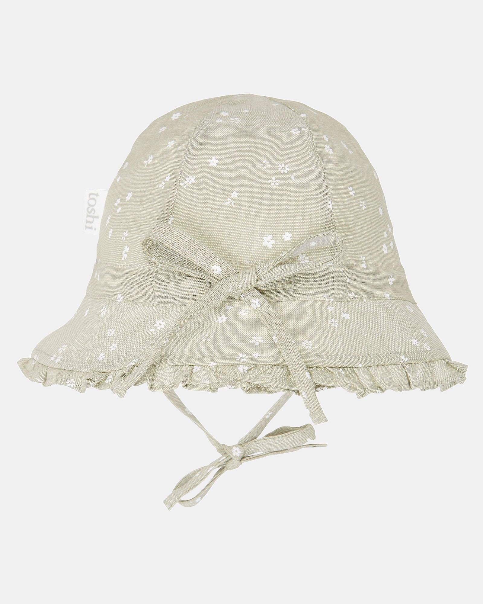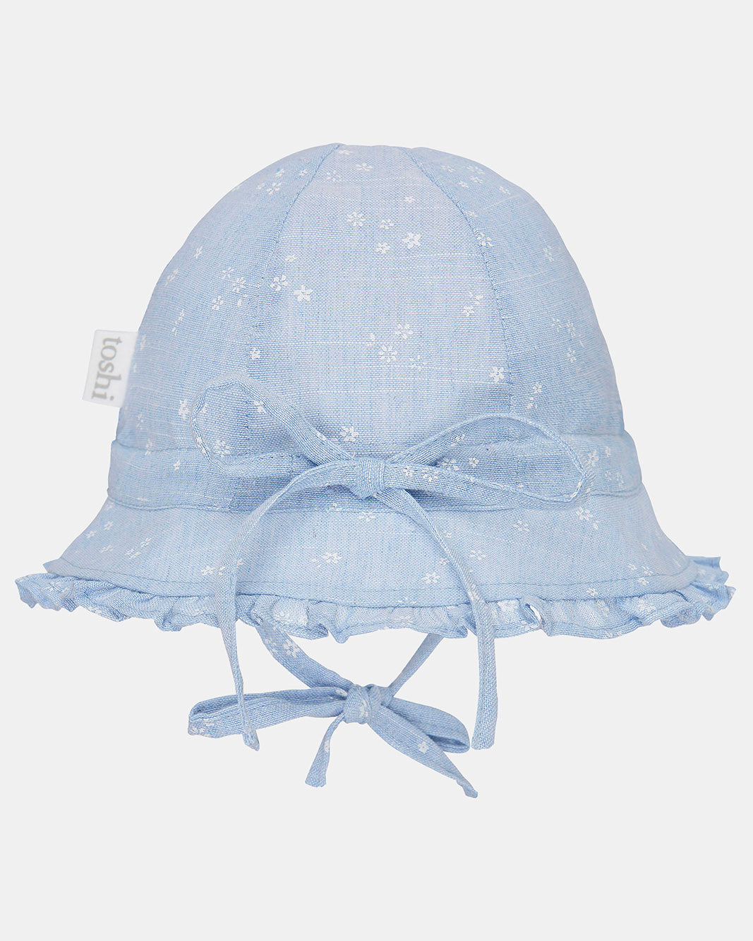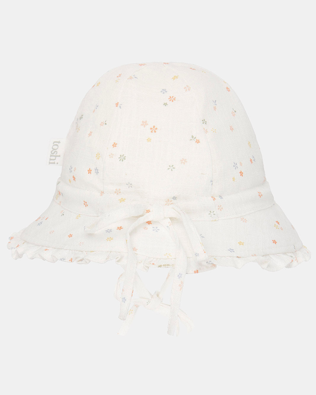 Toshi Bell Hat Milly is a flattering and feminine bell shaped hat. The baby sunhat is crafted from the finest quality 100% cotton. The head tie offers adjustable sizing and a chin tie secures the hat. The sunhat is fully lined for increased comfort. Pretty styling is created with a softly frilled border. An original and exclusive Toshi print design is featured.